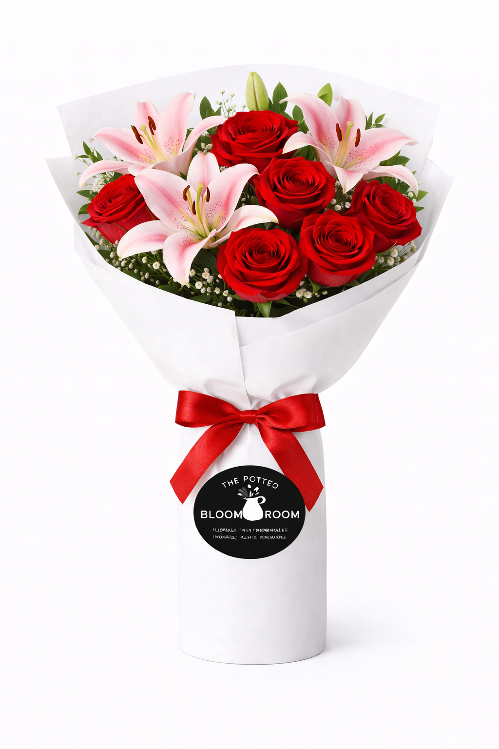 Stunning Reds sitting in with orientals makes a big lush Valentines Bouquet.