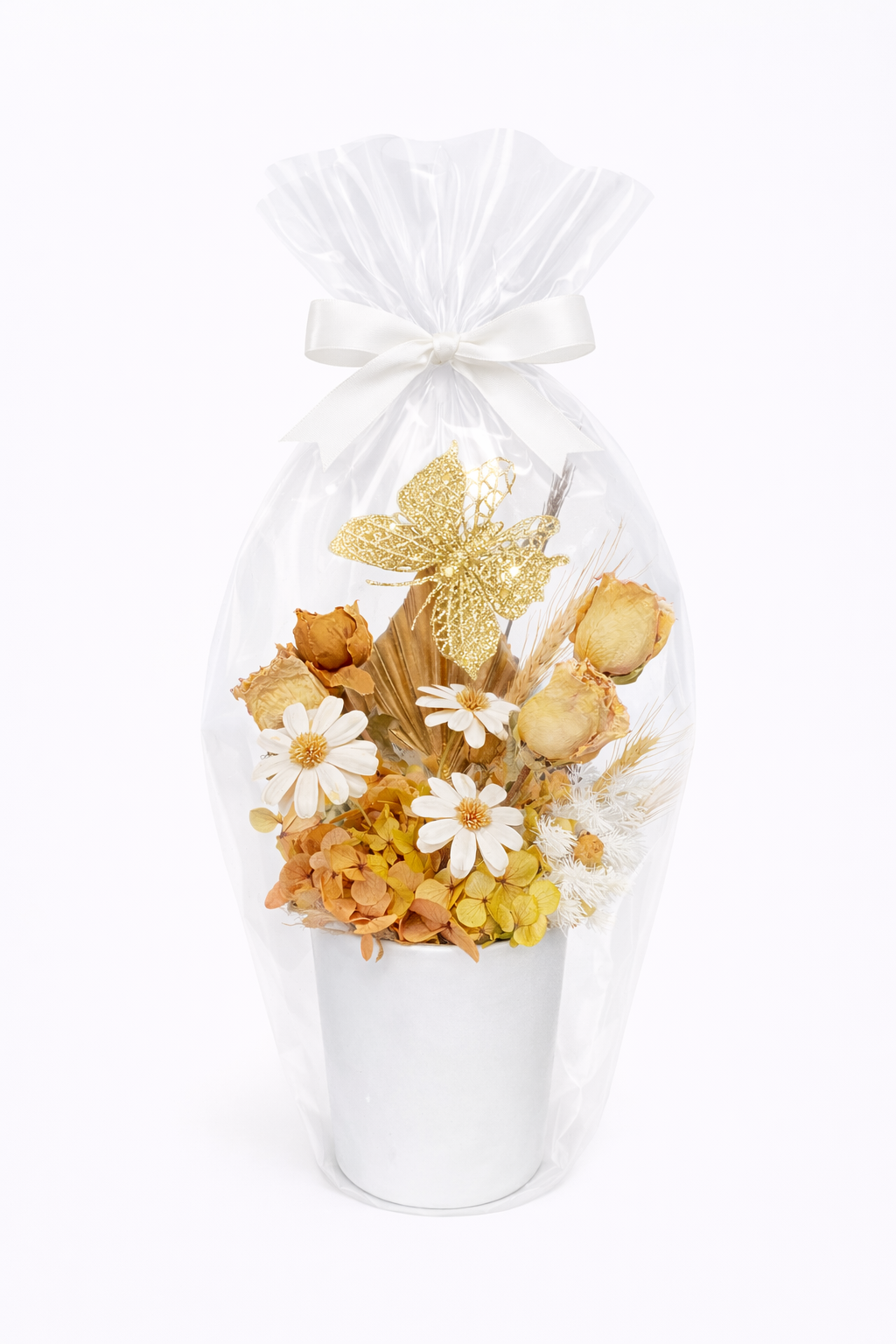 Our Daisy dried , is created with a stylish whites and mustards throughout. The white ceramic has a high gloss style whilst making it a a gorgeous gift to give.